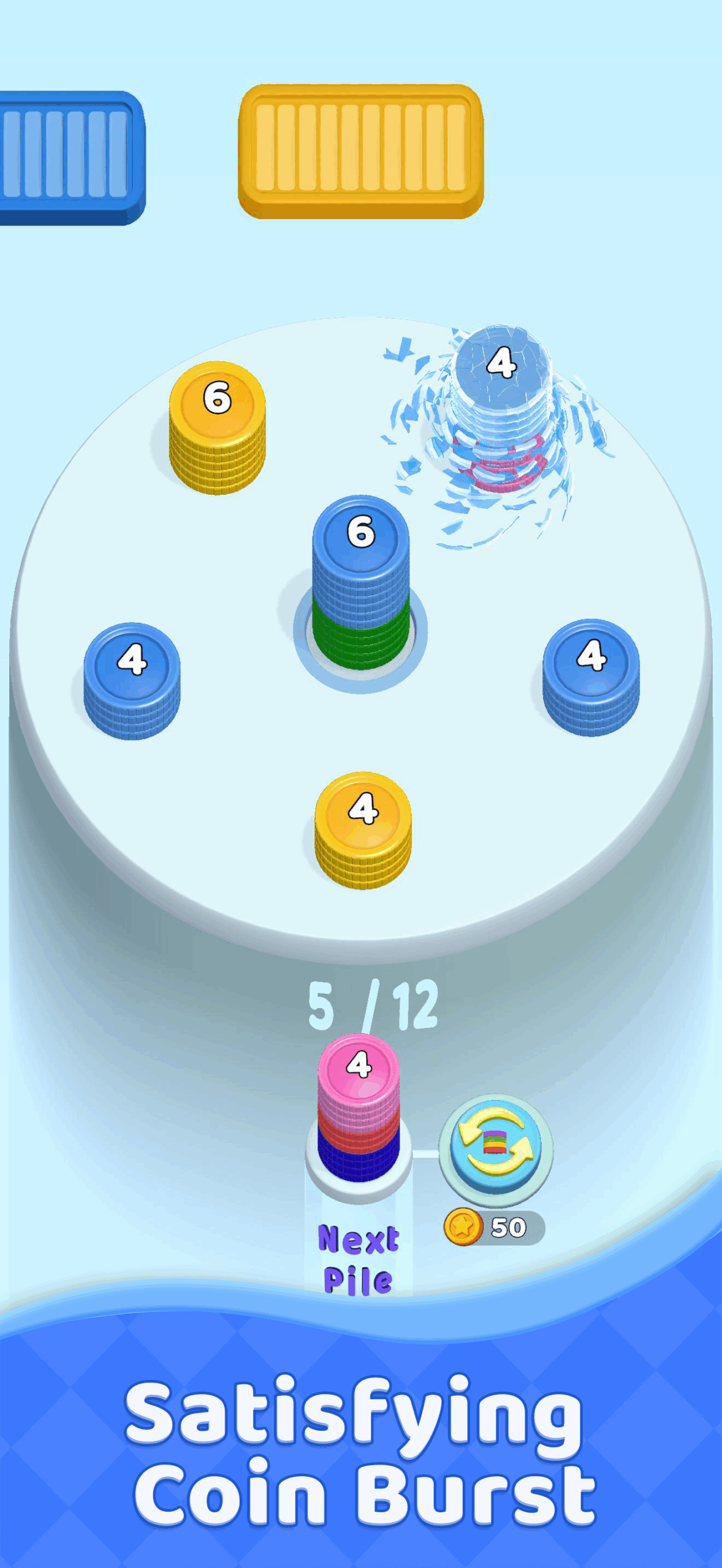When colors match, coins auto-merge with a satisfying cascade—complete with sparkle effects that make every correct move feel rewarding.